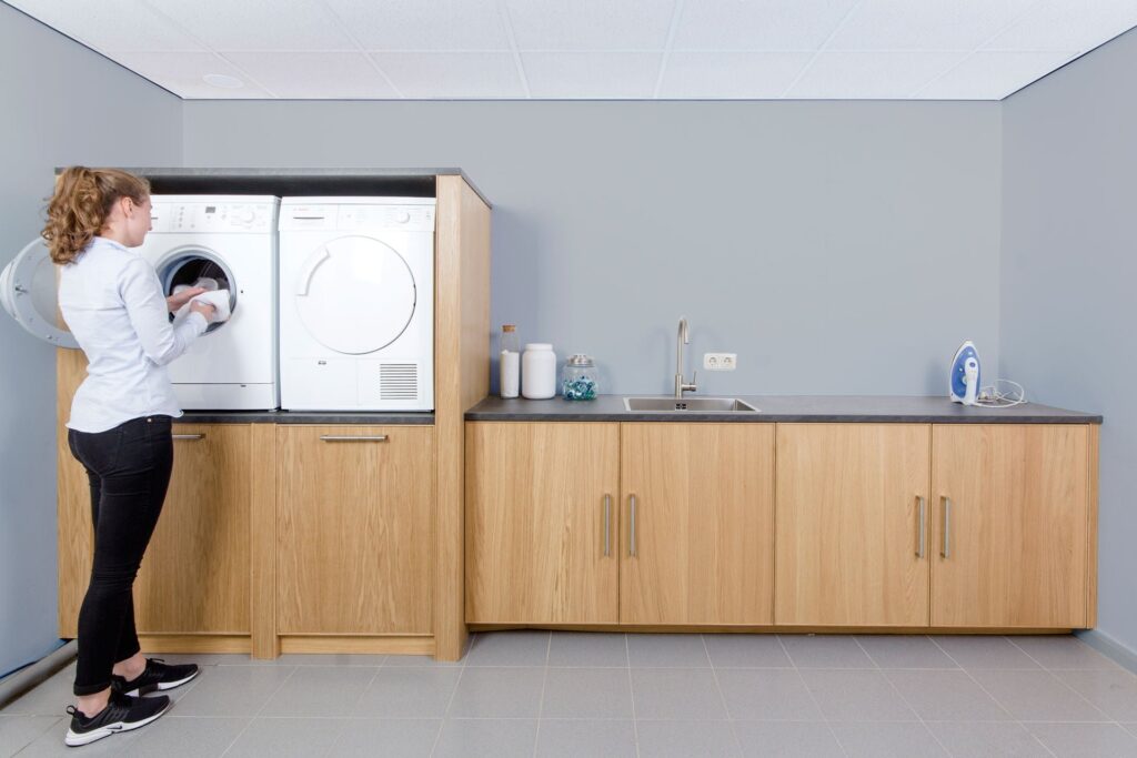 Van kille kelder getransformeerd tot een functionele wasruimte met op maat gemaakte kasten. Onze slim ontworpen kasten brengen comfort naar een hoger niveau door de wasmachines op een handige hoogte te plaatsen, waardoor bukken niet meer nodig is. Daarnaast hebben we gezorgd voor een luxueuze afwerking met eikenhouten meubels, die de ruimte een elegant tintje geven.