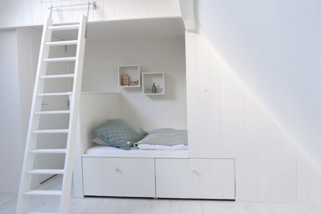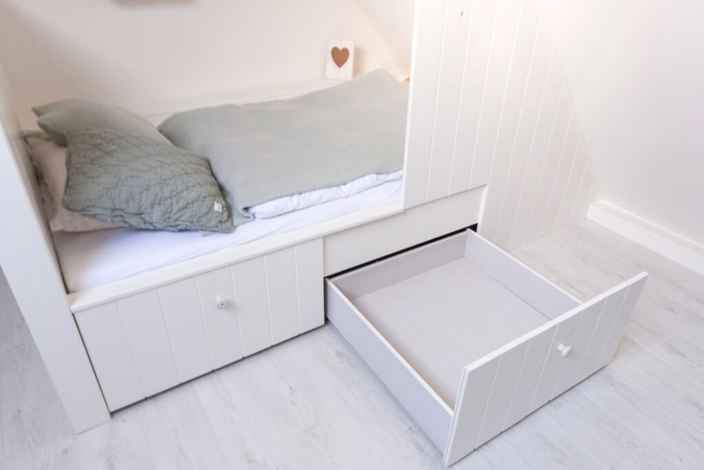Bij de verbouwing van deze zolder tot kinderkamer, hebben we door slim te ontwerpen, de ruimte optimaal benut. De combinatie van op maat gemaakte kledingkasten en een bed met handige opbergruimte, maakt deze ruimte gezellig en ruimtelijk. Deze charmante slaapkamer biedt een comfortabele en speelse omgeving. Met oog voor detail hebben we een ruimte gecreëerd die zowel functioneel als esthetisch aantrekkelijk is.